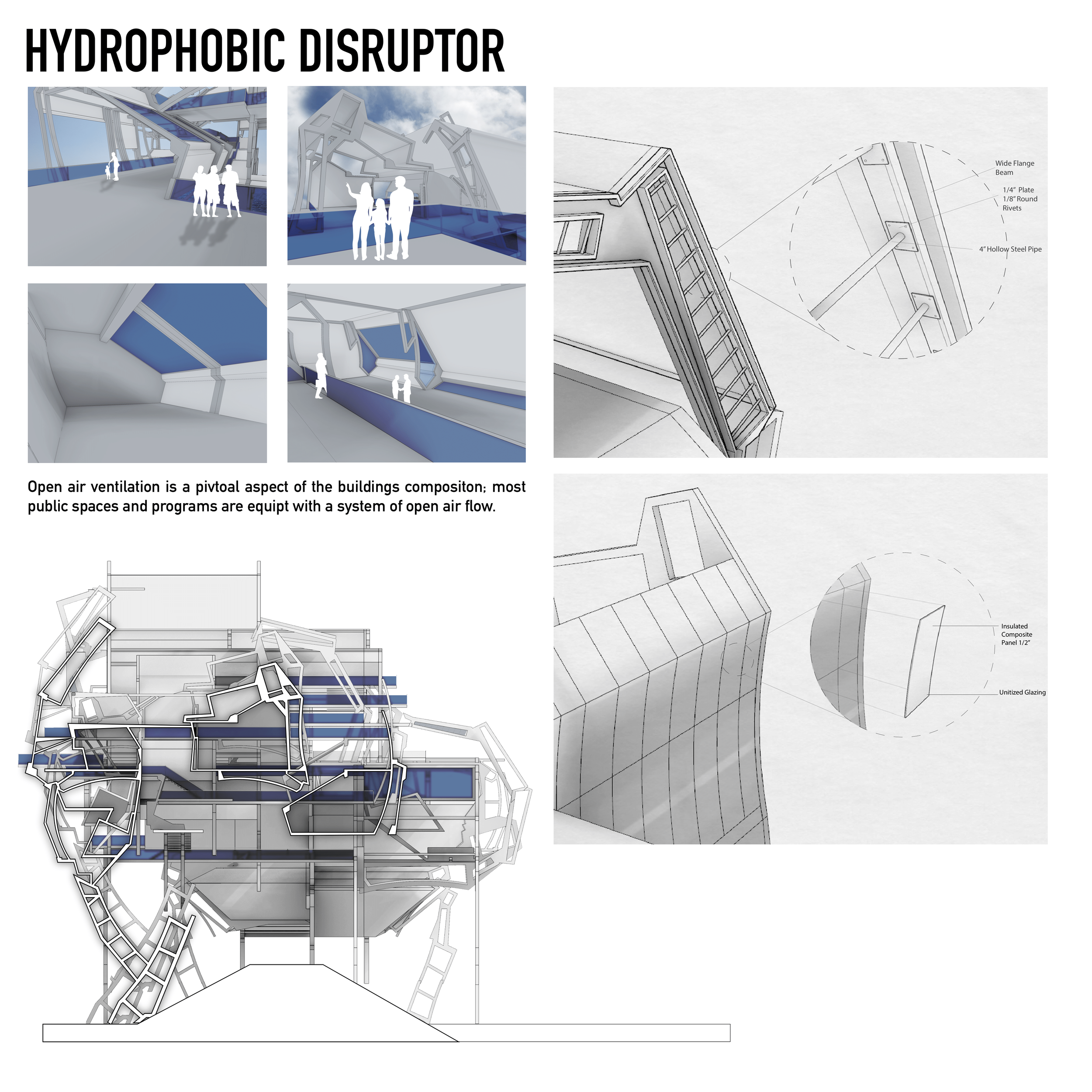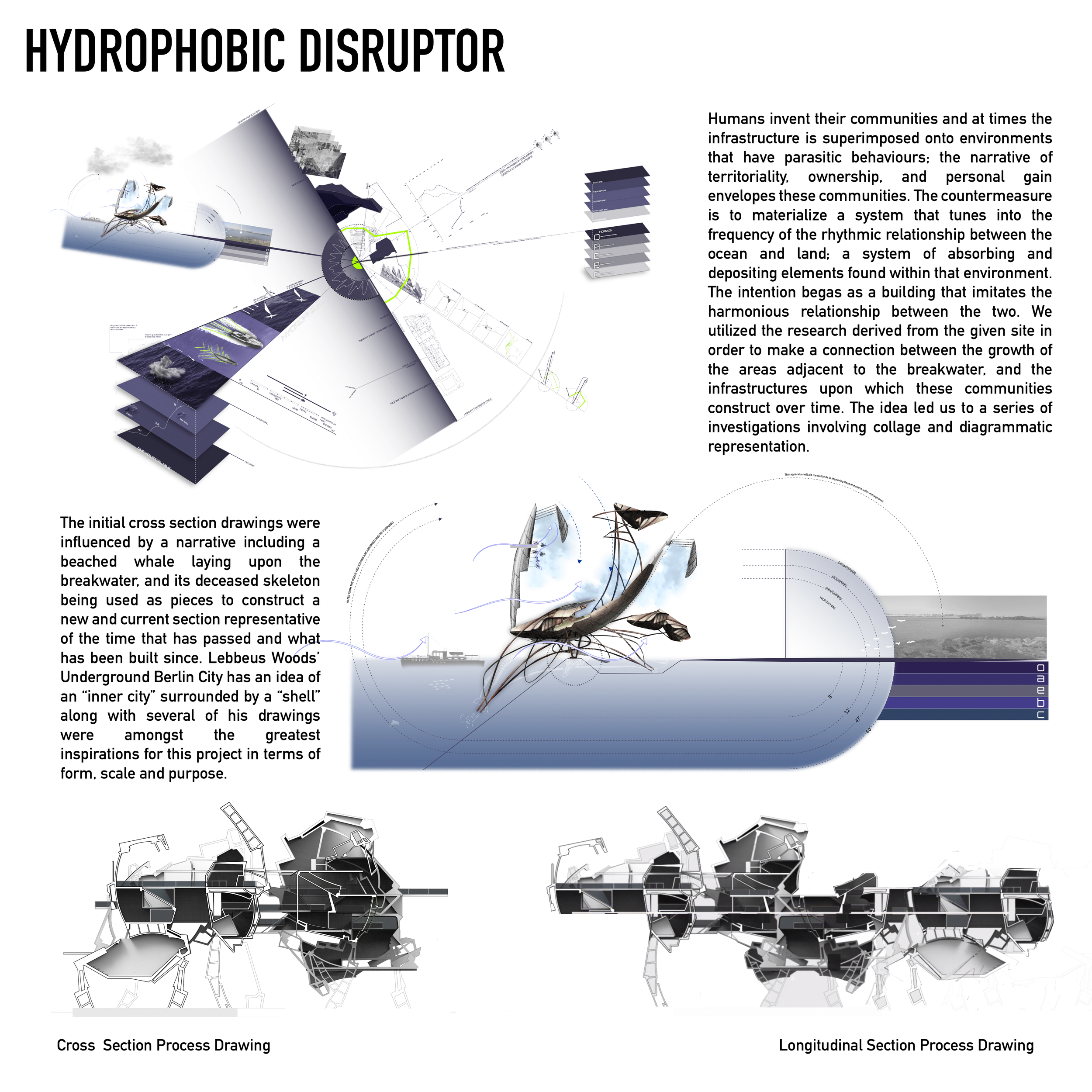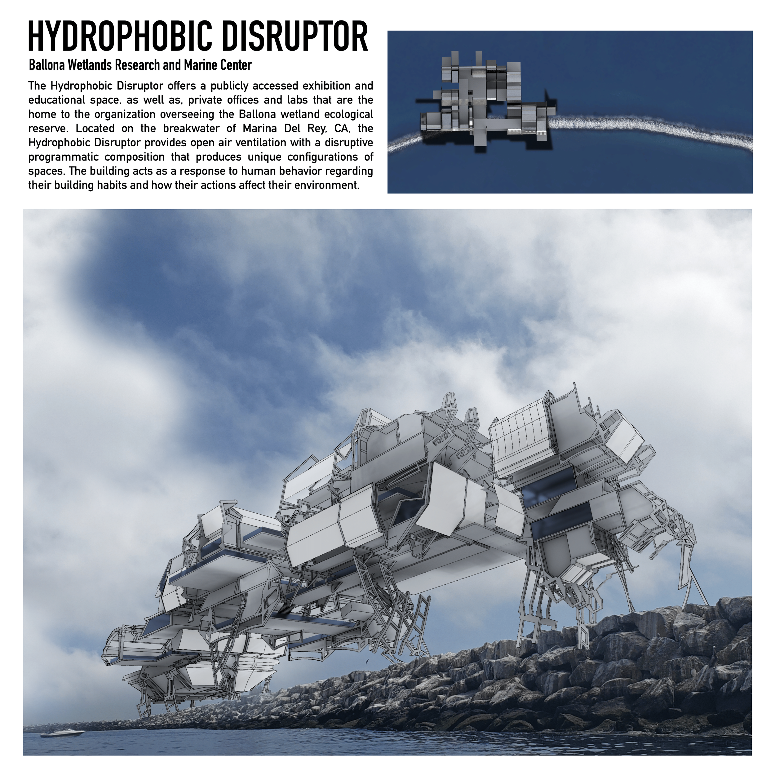 In this studio we were tasked with designing a publicly accessed exhibition and educational space, as well as, private offices and labs that are the home to the organization overseeing the Ballona wetland ecological reserve. With heavy inspiration from Lebbeus Woods, located on the breakwater of Marina Del Rey, CA, the Hydrophobic Disruptor provides open air ventilation with a disruptive programmatic composition that produces unique configurations of spaces. The building acts as a response to human behavior regarding their building habits and how their actions affect their environment.